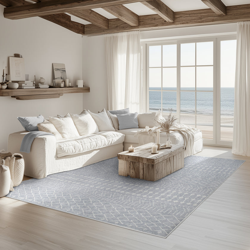 Coastal Serenity: A soft, woven neutral rug in grey and white tones can evoke a breezy, relaxed beach-inspired look.